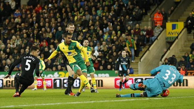 Bola yang ditendangnya mengarah pada pemain Norwich, namun diserobot oleh Alexis Sanchez yang langsung mengumpan pada Ozil.