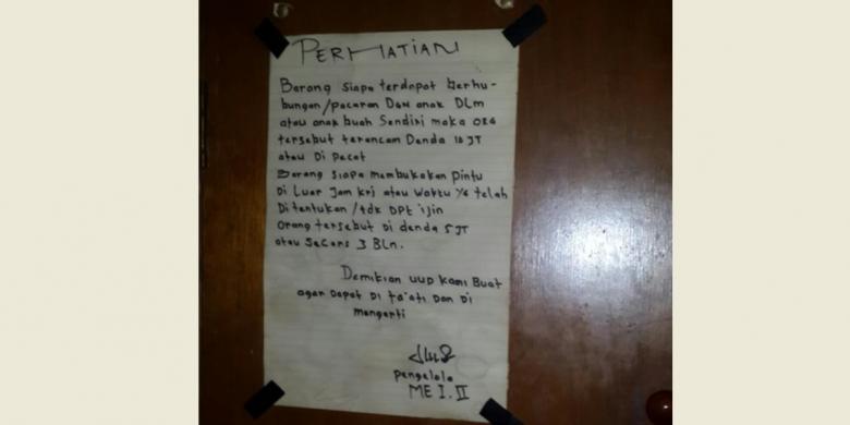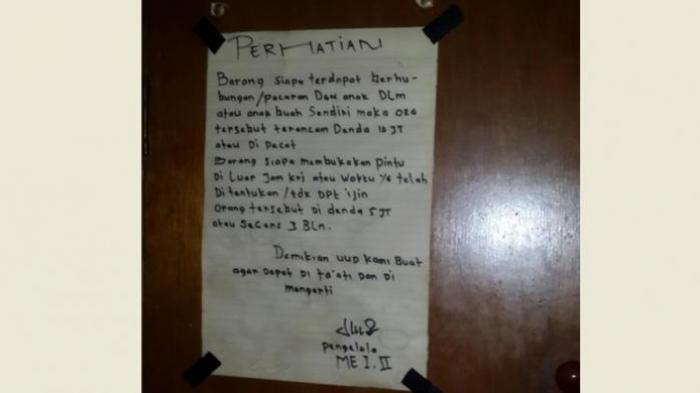 "Barang siapa membukakan pintu di luar jam kerja atau waktu yang telah ditentukan atau tidak dapat izin maka orang tersebut didenda Rp 5 juta atau secors (skorsing) tiga bulan," tulis pemilik.