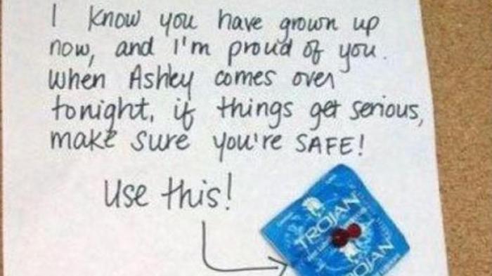 "Ibu mengerti kamu kini telah tumbuh dewasa, dan ibu bangga dengan itu. Saat Ashley (pacar sang anak) datang malam nanti, dan sesuatu yang "serius" terjadi, pastikan kamu berlaku aman. Pakai ini (kondom)."