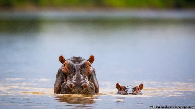 Induk kuda nil (Hippopotamus amphibius) dan anaknya di Taman Nasional Luangwa Selatan, Zambia.