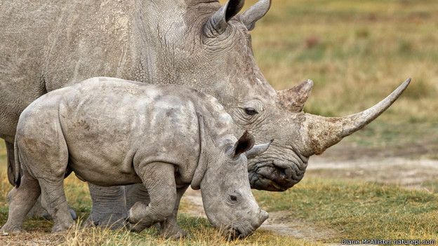 Induk badak putih (Ceratotherium simum) dan anaknya yang berusia dua bulan di dekat Danau Nakuru, Kenya.