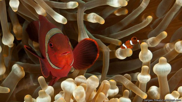 Ikan anemon (Premnas biaculeatus) dengan bayinya di Bali.