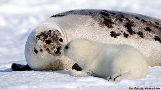 Anjing laut harpa (Phoca groenlandicus) menyentuh hidung anaknya di Quebec.