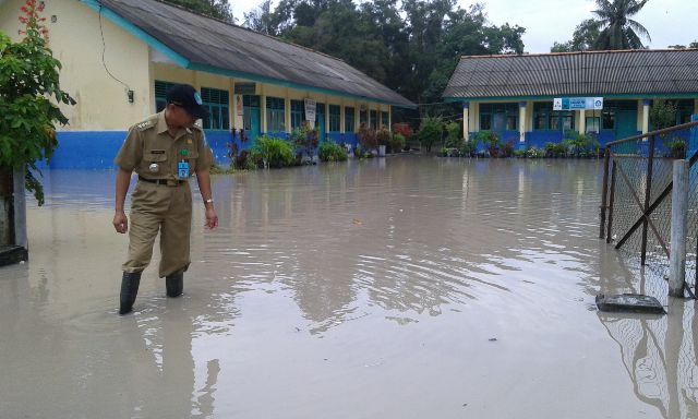 SDN 6 Riausilip di Desa Deniang Kabupaten Bangka, Selasa (29/3/2016). Camat Riausilip Saparudin saat meninjau banjir di lokasi tersebut.