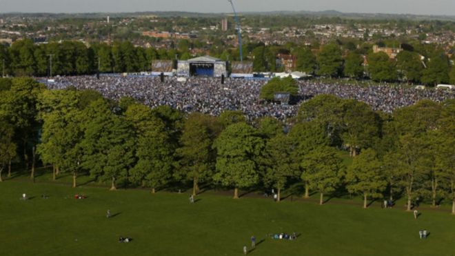 Kerumunan warga di Victoria Park, taman kota utama di Leicester, dalam jumlah terbesar dalam sejarah kota itu. (REUTERS)