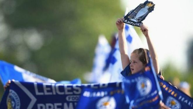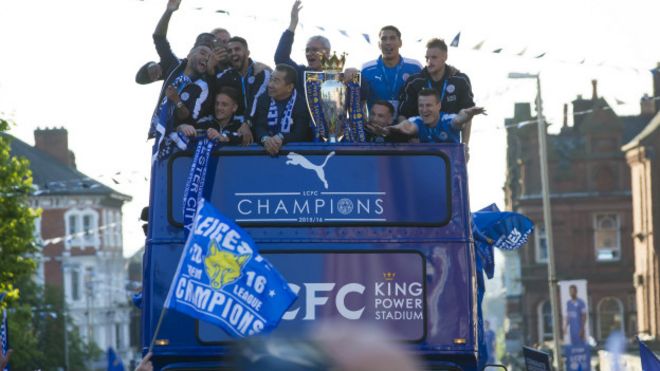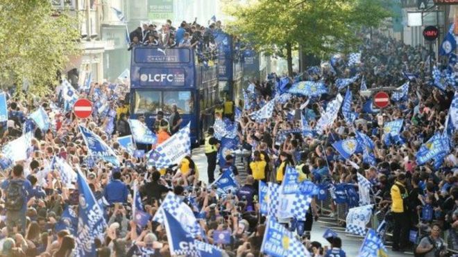 Mengendarai bis terbuka, para pemain, pelatih, dan staf, Leicester City diarak keliling kota menembus kerumunan warga bak lautan biru dan kibaran bendera biru putih.