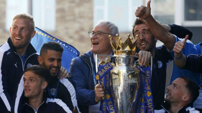 Pertama kalinya, Piala Liga Primer datang dan jadi bagian dari kota Leicester, dipertontonkan kepada masyarakat yang larut dalam pesta. Padahal, pada awal kompetisi hanya dijagokan dengan perbandingan 5000:1. (EPA)