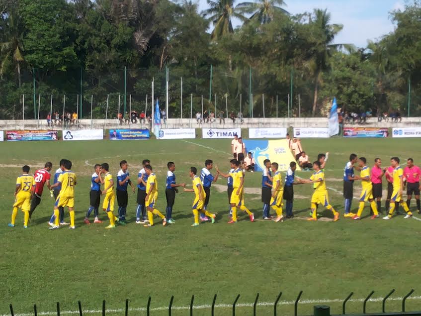 Pemain PS Bangka dan PSBl Langsa bersalaman sebelum laga Sabtu (4/6/2016) diStadion Orom Bangka. deddy marjaya