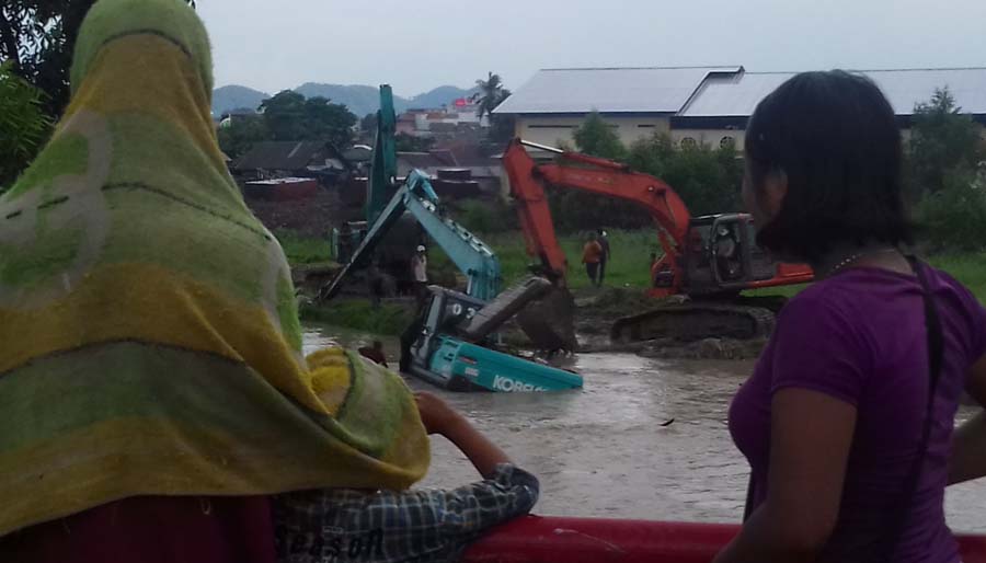 Hingga pukul 14.30 Wib, alat berat tersebut belum berhasil terlepas dari jebakan lumpur. Sementara itu arus yang mengalir di alur tersebut semakin deras.