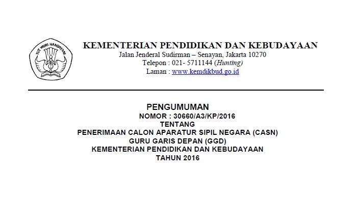 Kemendikbud memberikan kesempatan untuk para putra putri Bangsa untuk menjadi Aparatur Sipil Negara (CASN) Guru Garis Depan (GGD) Kmendikbud 2016.