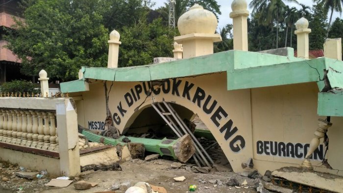 POSBELITUNG.COM, BANDA ACEH - Gempa berkekuatan 6,4 Skala Richter (SR) yang menggunjang Pidie Jaya mengakibatkan banyak kerusakan pada bangunan rumah warga, termasuk masjid bersejarah di Beuracan.