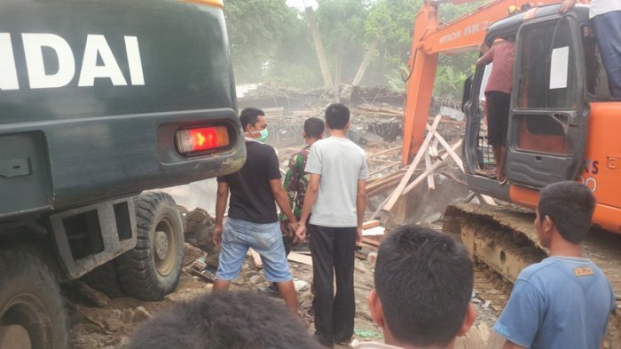 Proses evakuasi jasad H Jailani bersama istrinya Hj Faridah yang terkubur direruntuhan tiga ruko berlantai empat di Teupin Raya, Kabupaten pidie, Rabu (7/12/2016). SERAMBI INDONESIA/MUHAMMAD NAZAR