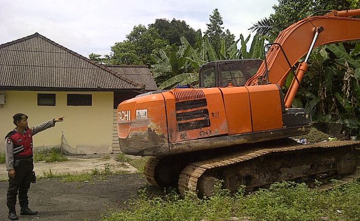 POSBELITUNG.COM, BELITUNG -- Satu unit eskavator alias alat berat bermerek Hitachi berwarna orange terlihat halaman barak asrama Polres Belitung, Selasa (31/1/2017).