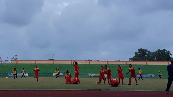 Pemain SSB Fita Perol Beltim U-16 berselebrasi usai mencetak gol ke gawang lawannya, SSB Madesa Riau Silip Bangka U-16 pada pertandingan yang berlangsung Kamis (3/8/2017). Fita Perol U-16 menang telak 3-0 pada laga ini. (POSBELITUNG/DEDY QURNIAWAN)