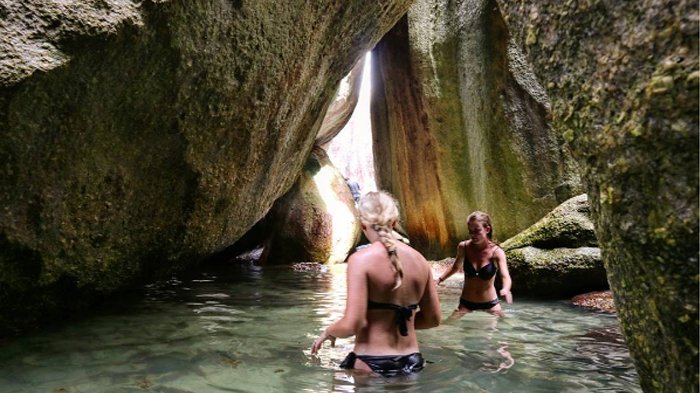 POSBELITUNG.COM - Dua cewek bule mengenakan bikini tampak basah-basahan di sebuah goa sempit.