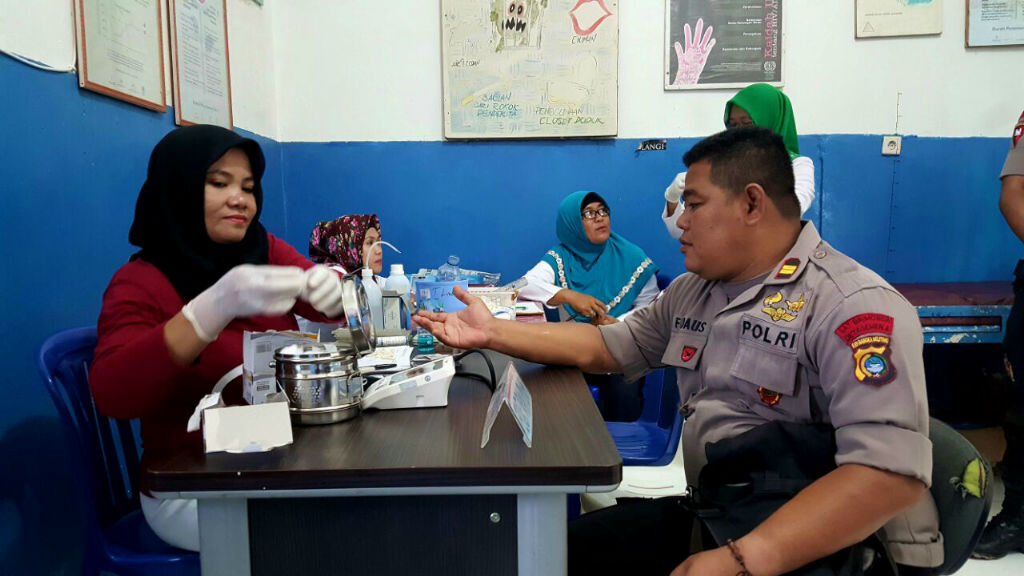 Sebelum donor darah, setiap anggota brimob ini akan diperiksa kesehatan seperti pengecekan darah, tensi dan lainnya.