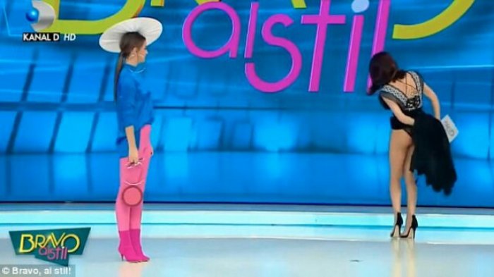 POSBELITUNG.COM - Seorang pembaca acara talent show di televisi Rumania, mengejutkan penonton ketika dia tiba-tiba menyingkap roknya di tengah siaran, Kamis (2/11).