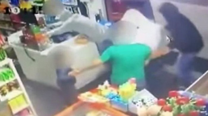 Tiba-tiba, tiga orang yang mengenakan tudung merangsek dan mulai mengacungkan senjata ke arahnya dan pemilik toko.