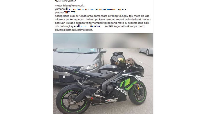 POSEBLITUNG.CO -- Seorang pengguna facebook baru-baru ini mengunggah status yang mengatakan bahwa dirinya kehilangan sepeda motor jenis Yamaha R6 yang diyakini hilang di sekitar rumahanya di Damansara.