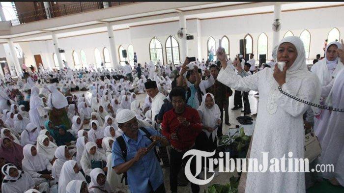 Saat khofifah melangkahkan kaki, ribuan jemaah berebut bersalaman.