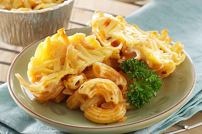 3. Masukkan makaroni. Aduk rata. Tuang ke dalam cup alumunium. Tabur dengan keju mudah leleh. Oven dengan api bawah suhu 170 derajat Celcius 20 menit sampai matang.