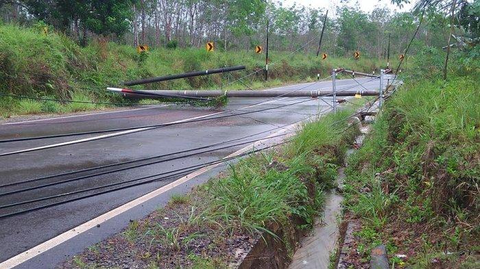 Dua tiang listrik PLN tegangan menengah tiba-tiba tumbang dan melintang di ruas jalan itu di tengah hujan lebat.