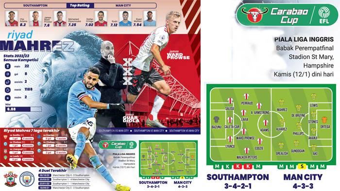 Manchester City mendatangi markas Southampton, Stadion St Mary, Hampshire dalam perempatfinal Piala EFL, yang juga dikenal sebagai Piala Liga Inggris, Kamis (12/1/2023) dini hari nanti.