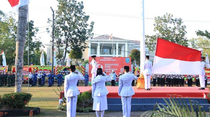 Upacara penurunan bendera dalam rangka HUT ke-79 Kemerdekaan Republik Indonesia di halaman Kantor Bupati Belitung berjalan lancar.