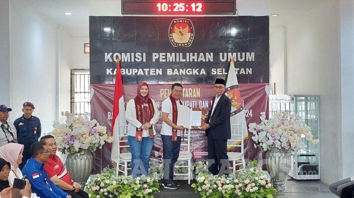 Riza Herdavis dan Debby Vita Dewi pada Rabu (28/8/2024) siang mendatangi KPU Bangka Selatan untuk mendaftarkan pencalonan di Pilkada Bangka Selatan 2024.
