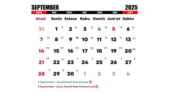 Berikut rangkuman tanggal pada kalender September 2025 lengkap dengan penanggalan Jawa dan Hijriyah:
