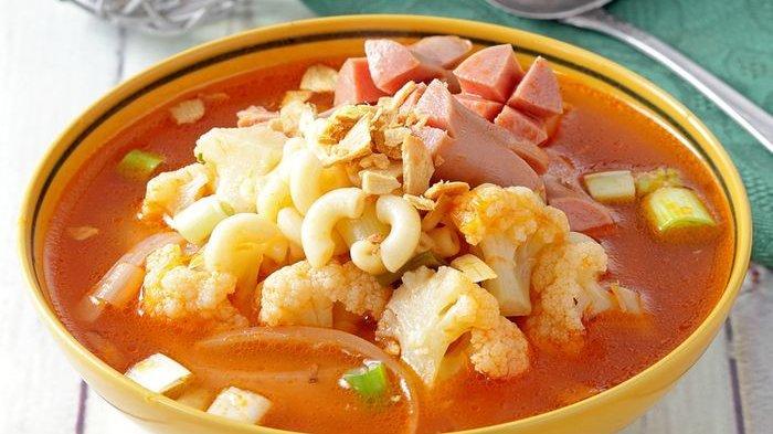 Kuah dari Resep Sup Makaroni Sosis Kembang Kol ini segar dan gurih karena memadukan saus tomat dan kaldu daging.