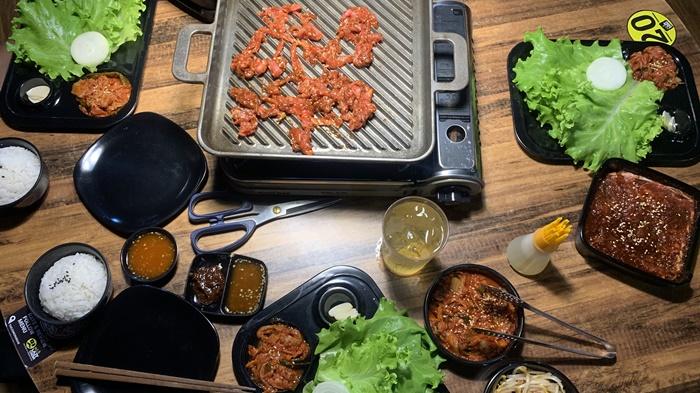 Memang nih, ketika pengen menikmati menu ini, ada dua set kompor lengkap dengan alat pemanggang dan wadah sup disediakan.